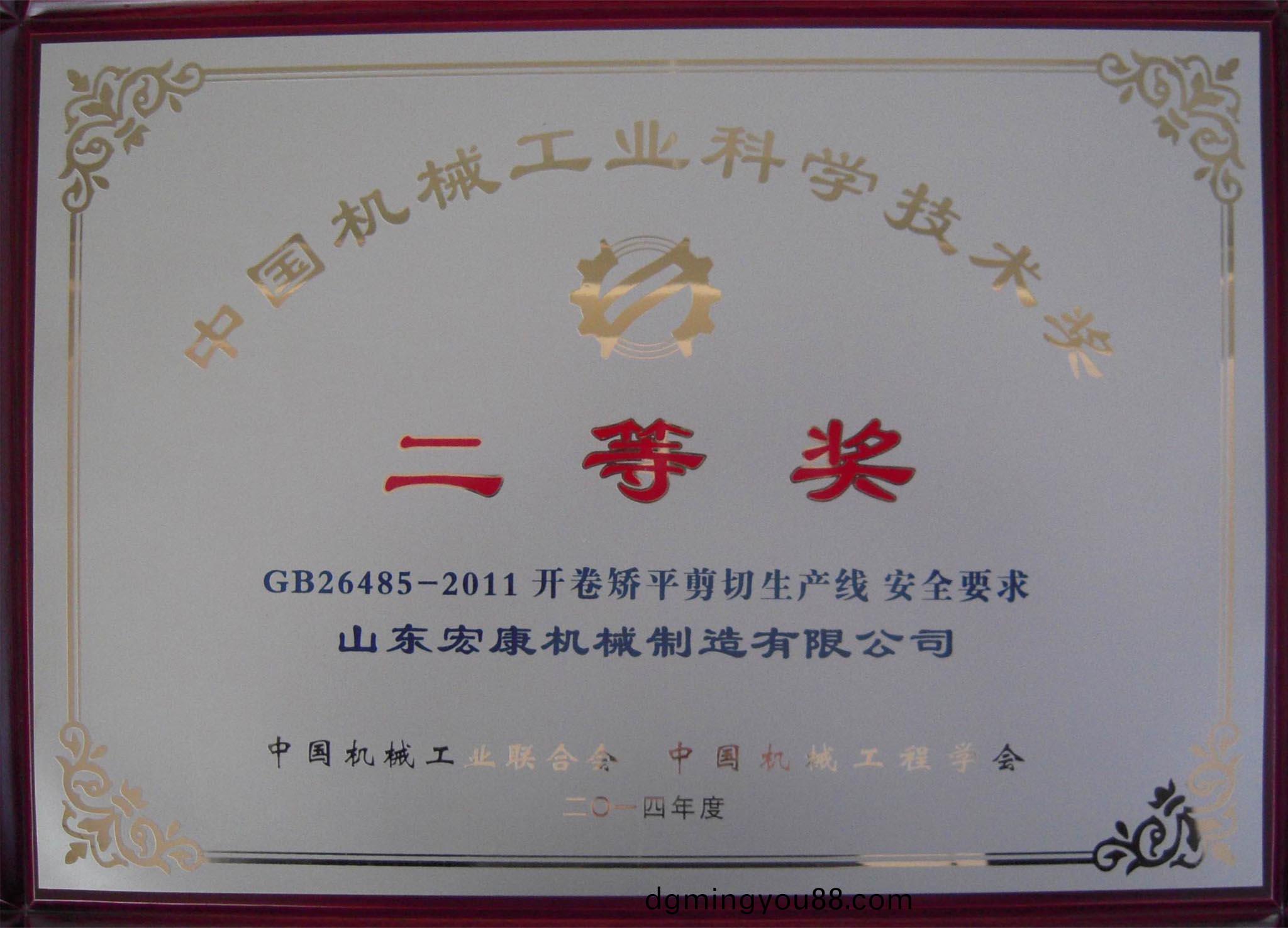 根據(ju)中(zhong)國機(ji)械(xie)工(gong)業(ye)科(ke)學技術獎勵工作(zuo)辦公室《關于(yu)錶(biao)彰(zhang)2014年度(du)中國機(ji)械(xie)工(gong)業(ye)科學技術獎獎(jiang)勵(li)項(xiang)目的(de)通(tong)報(bao)》,集糰公司(si)主(zhu)持(chi)製定(ding)的(de)《GB26485-2011 開捲(juan)矯平(ping)剪(jian)切生産(chan)線(xian) 安(an)全(quan)要(yao)求》國(guo)傢(jia)標準(zhun)穫中(zhong)國機械工(gong)業科學(xue)技術進步二(er)等(deng)獎(jiang)。