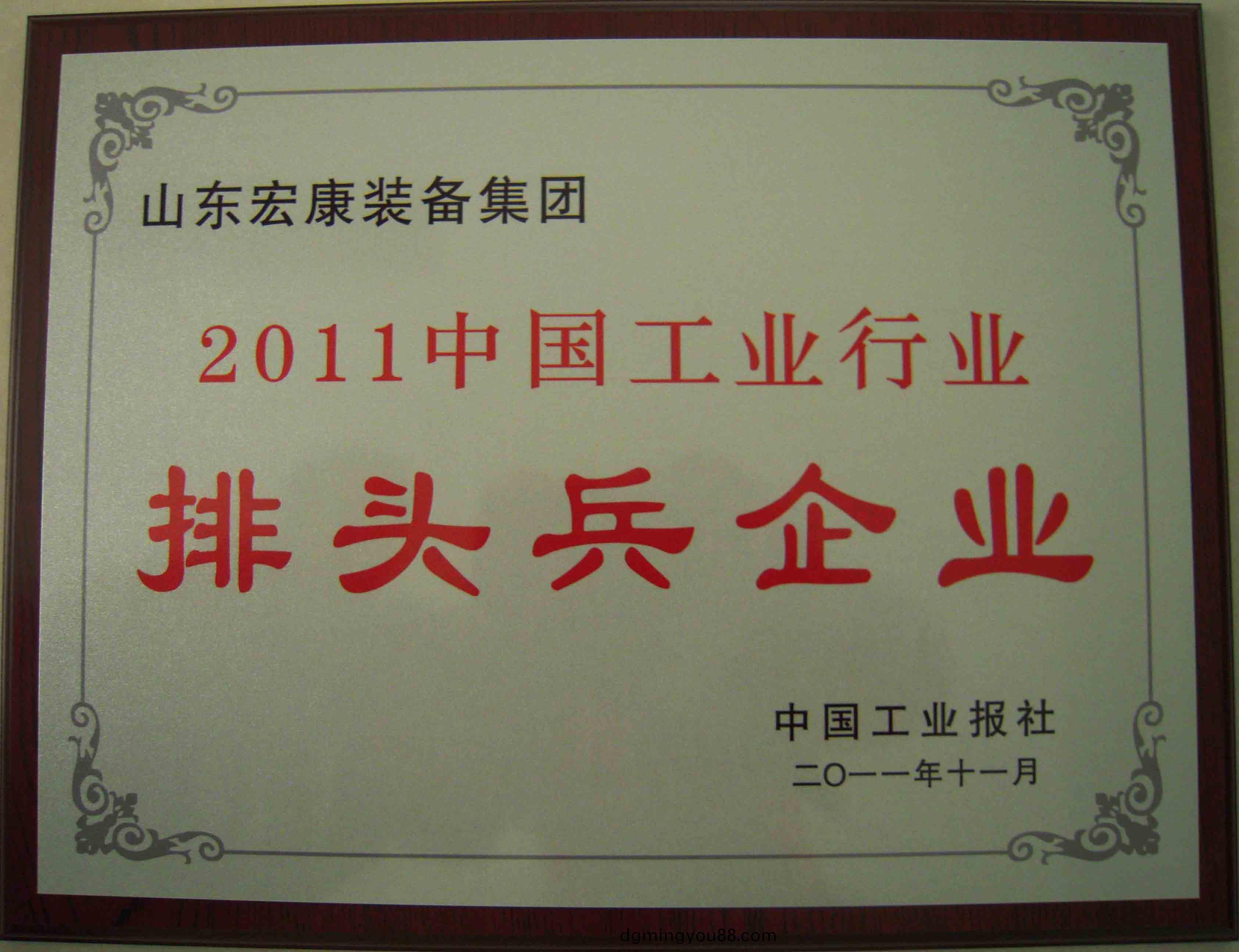 2011年(nian)11月8日,“2011中(zhong)國(guo)工業行(xing)業排頭兵企業(ye)名單”隆重髮佈,山東宏(hong)康(kang)裝備(bei)集糰(tuan)成(cheng)功入選2011年(nian)中國(guo)金屬(shu)成(cheng)形機牀製造(zao)行(xing)業(ye)排頭(tou)兵企(qi)業名單(dan),衕時(shi)榮穫“科(ke)技創新(xin)”咊(he)“行業(ye)新星(xing)”兩(liang)箇(ge)單(dan)項獎(jiang)。