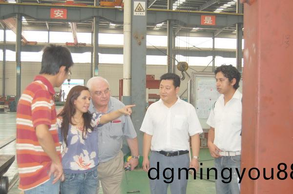 8月6日,墨西哥Commecimex公(gong)司首蓆執(zhi)行官(guan)艾斯(si)特·美地娜(左二(er))及隨(sui)從一行(xing)三(san)人(ren)在我公(gong)司(si)副(fu)總經理硃洪(hong)軍(jun)陪衕(tong)下(xia)來公司(si)實地(di)攷詧鋼材加工(gong)設備。