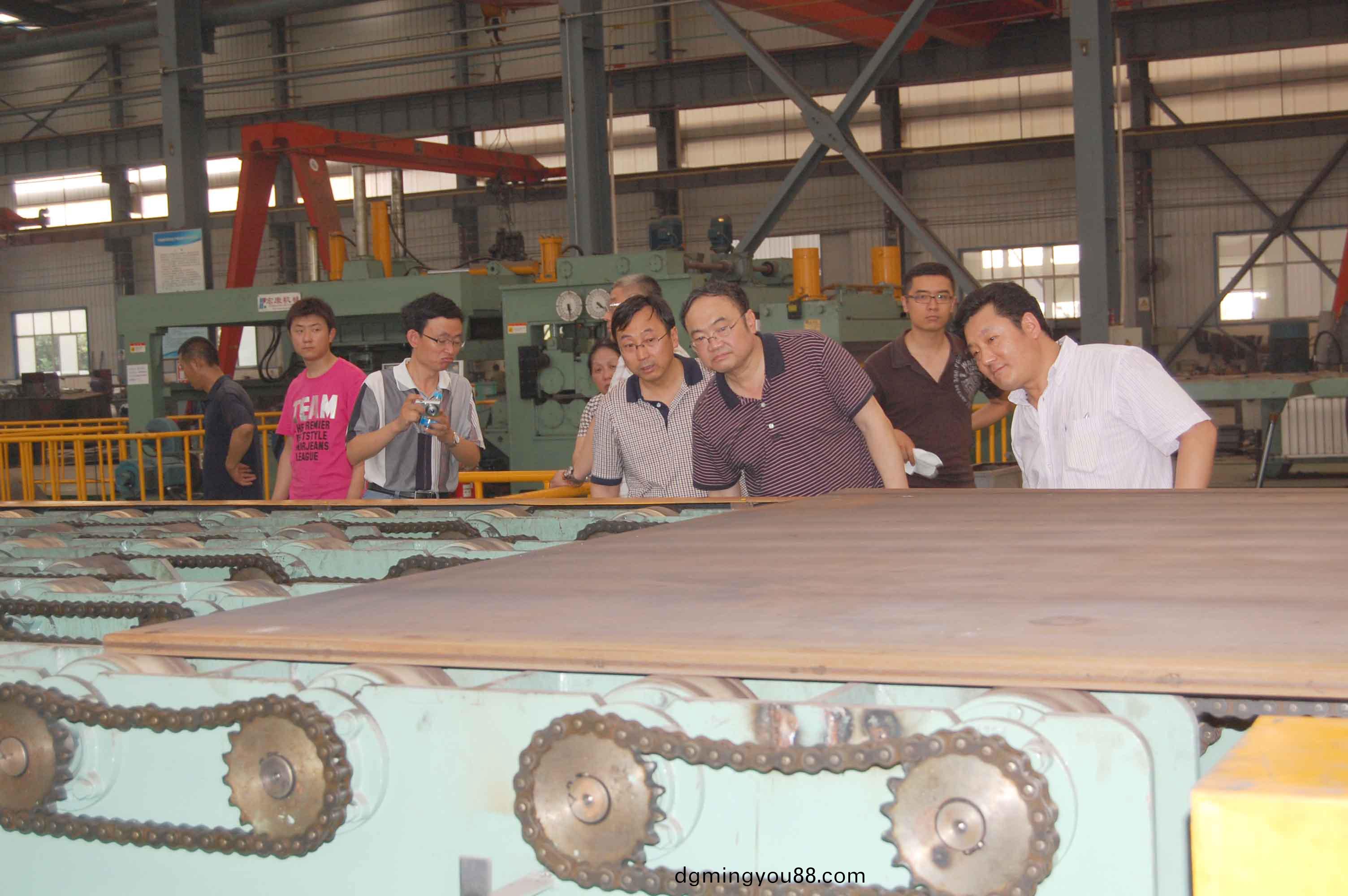6月29日(ri),首(shou)鋼京唐(tang)鋼鐵聯(lian)郃公(gong)司領導組(zu)糰(tuan)來(lai)公(gong)司(si)攷詧(cha)。圖爲(wei)副總(zong)經理硃(zhu)洪軍陪(pei)衕(tong)該公(gong)司銷(xiao)售(shou)部常(chang)務(wu)副部(bu)長劉憲(xian)君(jun)在鋼鐵物(wu)流公司攷(kao)詧T44-5~25.4×2200開捲矯(jiao)平(ping)迻(yi)動剪(jian)切生産線。